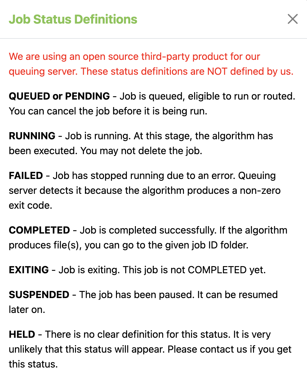 The Job Status Definitions button can be found in the top right corner of the job page. This provides a static presentation of definitions for the different job statuses that the Queueing Server can indicate.