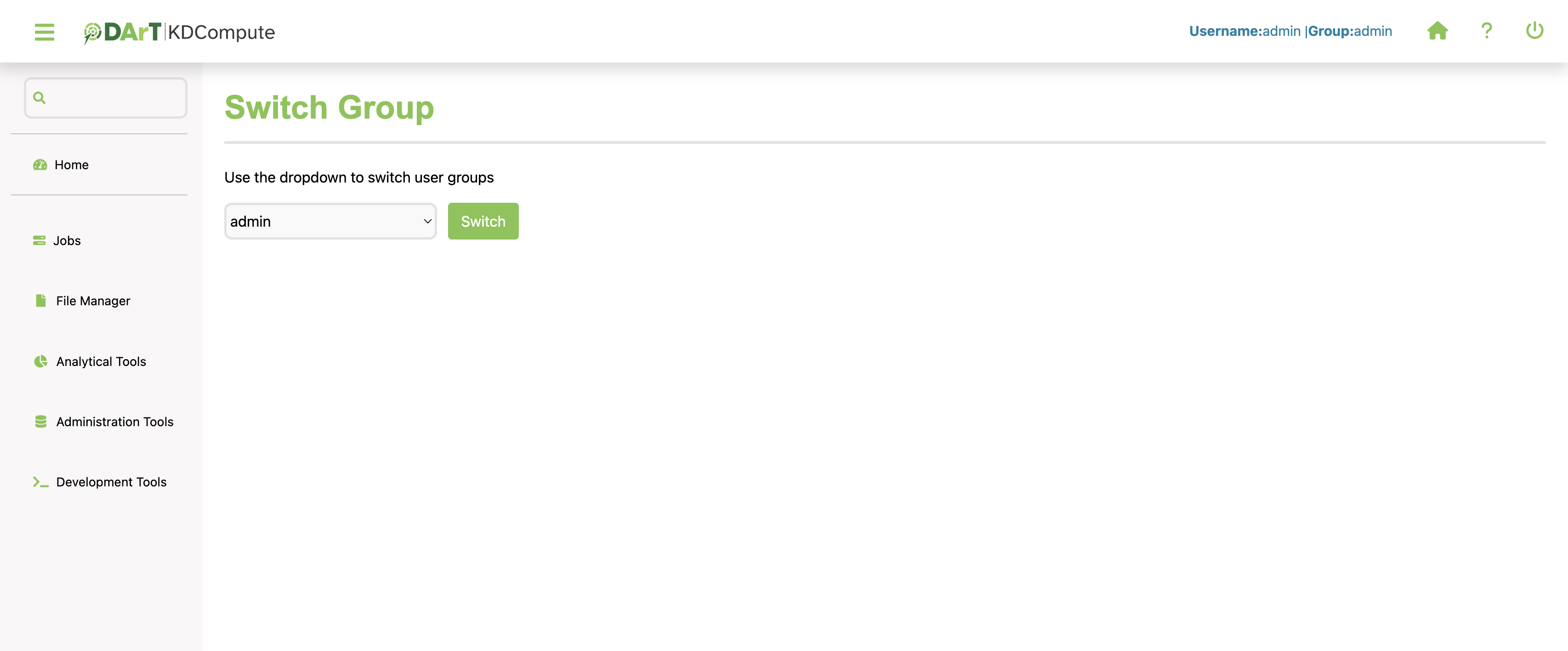 Select a group to use for the session. If the user is assigned to a single group, KDCompute will automatically set the group without prompting. A KDDart user with multiple groups can seamlessly switch between groups without the need to log out of KDCompute.